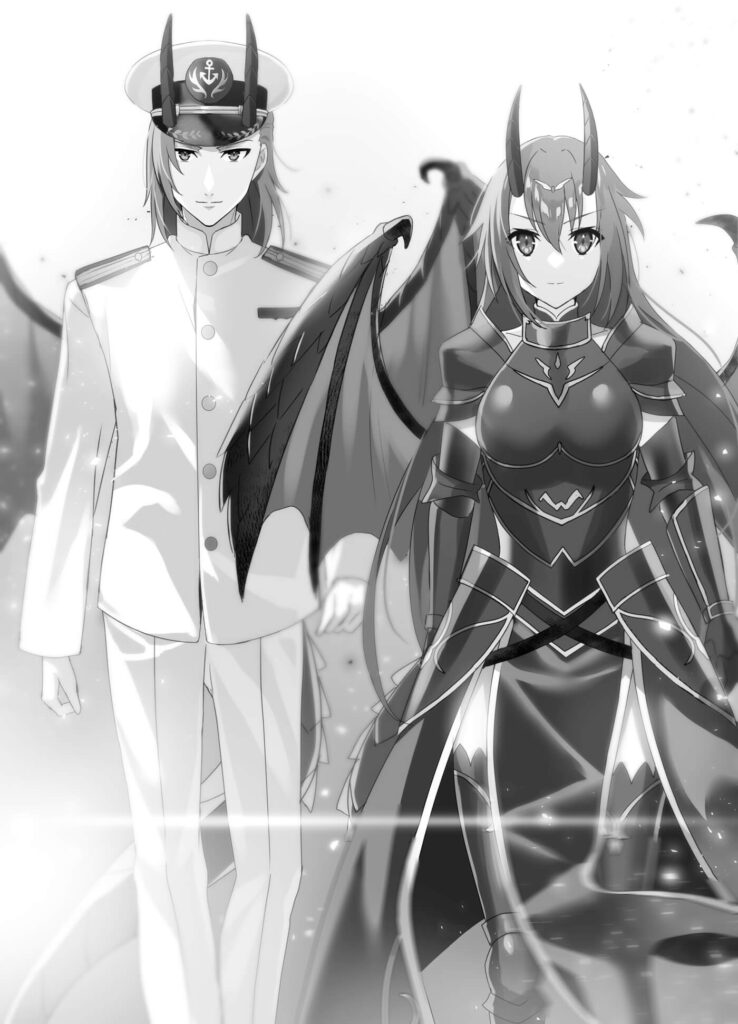 Une nouvelle personne s’approcha d’eux à grands pas. Cette femme avait également les traits d’un dragon, avec une corne unique sur le front, des ailes dans le dos et une queue, mais ses cheveux et ses écailles étaient bleus. Elle portait un uniforme de marine semblable à celui de Juna, avec une rapière à la hanche.