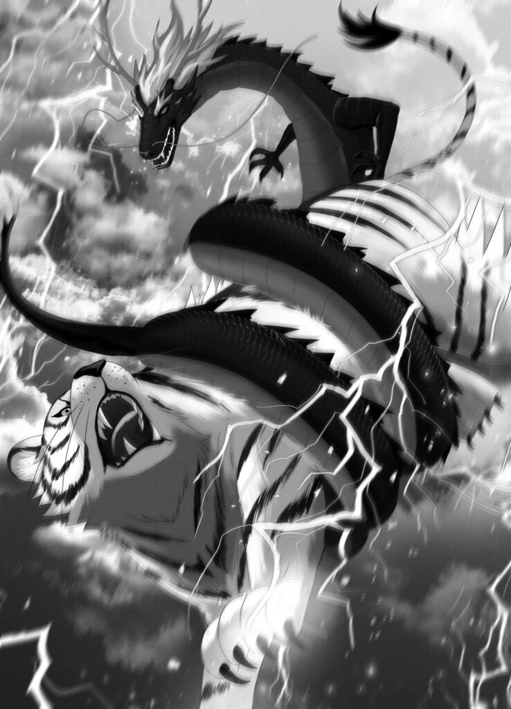 Naden avait repris sa forme de ryuuu noir au moment où elle se rapprochait de Fuuga et Durga, et elle les percuta avec une force considérable. Après avoir encaissé une telle attaque, même Durga fut incapable de rester en l’air. Le tigre tenta de se rétablir en tombant au sol, mais Naden enroula rapidement son long corps serpentin autour de Durga.
