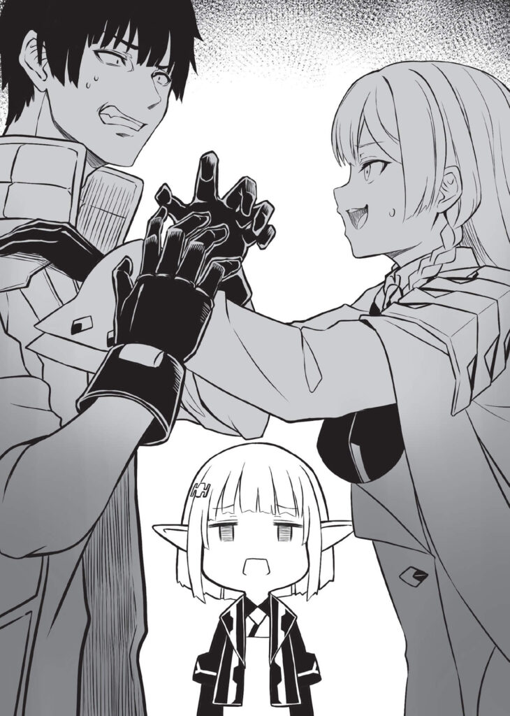 La fille aux cheveux argentés, aux yeux dorés et aux oreilles de renard qui m’avait réveillé — Kugi — rougissait en me regardant, j’avais exposé le haut de mon corps en me redressant. Vu la façon dont elle rougissait pour quelque chose d’aussi insignifiant, elle était bien trop innocente. Je trouvais cela plutôt rafraîchissant.